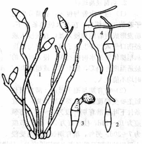 病菌菌絲具有分隔和分枝,初期無色,后變褐色。分生孢子梗從病組織的氣孔或表皮成簇生出,很少單生,不分枝,一般有2?4個隔膜,基部較粗,頂部較細,分生弛子脫落后,梗頂部成曲折狀。分生孢子無色或淡褐色,洋梨形或倒棍棒形,頂端鈍尖,基部鈍圓,有腳胞,成熟后常具2個隔膜。多數(shù)砲子萌發(fā)時從頂部或基部細胞萌發(fā)伸出芽管,芽管頂端形成球形或卵圓形、褐色、厚壁且光滑的附著胞,然后長出侵染絲,侵入寄主組織。