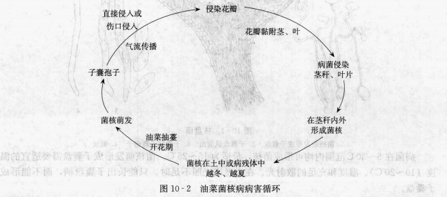 病菌以菌核在土壤、病殘?bào)w和種子中越夏(冬油菜區(qū))、越冬(冬、春油菜區(qū))。病殘?bào)w、種子中的菌核隨著施肥、播種等農(nóng)事操作進(jìn)入土壤中。春季,在旬平均氣溫超過(guò)5°C、土壤濕潤(rùn)的條件下,土壤中的菌核陸續(xù)萌發(fā)。油菜抽薑開(kāi)花期間、旬平均氣溫8?14C時(shí),大量形成子囊 盤(pán)。子囊盤(pán)初現(xiàn)至終止歷時(shí)20?50d。每個(gè)子囊盤(pán)噴射子囊砲子的持續(xù)時(shí)間為8?15d。子囊抱子隨氣流傳播最遠(yuǎn)可至數(shù)公里。通常情況下,子囊弛子萌發(fā)侵染花瓣,帶菌花瓣脫落至葉片上引起葉片發(fā)病,葉片病斑擴(kuò)大蔓延至莖,或病花瓣黏附莖稈,而誘發(fā)莖部發(fā)?。▓D10 - 2)。