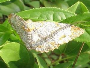 成蟲:雌成蟲體長為24~25mm,翅展為67?76mm。觸角絲狀。體翅均灰白色,密布灰黑色小點。前翅基線、中橫線和亞外緣線處各有1條不規(guī)則的黃褐色波狀紋,后翅為2條波狀紋,外緣緣毛黃褐色,腹部末端具黃色絨毛。雄蛾體長為19?23mm,翅展為50?61mm,觸角羽毛狀,前、后翅基線和亞外緣線處均有1條灰黑色波狀紋,腹末尖細。