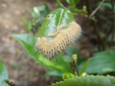 成蟲在17:00?19:00羽化,19:00?23:00活動最盛。一般雄蛾比雌蛾早羽化1?2d。成蟲具趨光性,白天棲息在茶叢內(nèi),稍受驚動即迅速飛翔,或墜地作假死狀。成蟲壽命3?5d,活力強(qiáng),一般交尾1次,偶有2次以上的。雌蛾交尾當(dāng)天或第二天產(chǎn)卵,以21:00?22:00產(chǎn)卵最盛。卵產(chǎn)于老葉背面, 呈塊狀,覆以黃色絨毛。每雌產(chǎn)卵量為100?200粒,多者可達(dá)300粒以上,一般分作2塊。卵塊于茶叢中、下部老葉背面為多,但為害嚴(yán)重的茶園,也會產(chǎn)于枝干、枯葉或雜草上。同一卵塊的卵一般在同一天內(nèi)孵化完畢,孵化率達(dá)90%以上。孵化盛期往往在始孵期后5天左右。剛孵化后的幼蟲先取食卵殼,然后取食葉片。一至二齡幼蟲取食下表皮和葉肉,使葉片呈淡綠色至淡黃褐色半透明薄膜。三齡后食葉量顯著增多,從葉緣向內(nèi)咬食葉片成缺刻,或全葉食去,僅留葉柄,猖獗時可將嫩枝皮、花蕾及幼果食盡。五齡后食量劇增,整枝、整叢葉片不存,且枝間常留有絲網(wǎng)、蟲糞和碎葉片。取食多在晨昏和夜晚。幼蟲期以第一代最長,為49?52d,第二、三代分別為24?34d和31?35d。幼蟲的發(fā)育起點溫度為(6.16±2.14)℃,有效積溫為(820.24±99.39)℃。