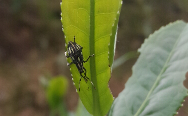 茶麗紋象甲(Myllocerinus aurolineaUus Voss)又稱茶葉象甲、茶小綠象甲,屬鞘翅目象甲科。在全國(guó)均有分布,主要分布在江南茶區(qū),以浙江、江蘇、安徽、江西、福建、四川、湖南、湖北、廣東、廣西、云南等省份發(fā)生較嚴(yán)重。該蟲(chóng)主要以成蟲(chóng)為害綠茶區(qū)的夏茶,也為害烏龍茶區(qū)的春茶,咀食茶樹(shù)葉片使嫩葉形成不規(guī)則弧形缺刻,嚴(yán)重時(shí)僅留主脈,為害中度的達(dá)20%左右,嚴(yán)重的達(dá)50%以上。食性雜,除為害茶樹(shù)外,還為害梨、杏、桃、李、柑橘、蘋果、油茶、山茶、洋槐、板栗、芝麻、辣蓼、甘薯、油桐、金剛刺以及豆類綠肥等。