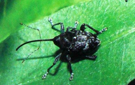 成蟲:體長(zhǎng)為7?11mm,全體黑色,疏被白色絨毛,構(gòu)成規(guī)則的斑紋,腹面鱗毛甚密。觸角膝狀,端部3節(jié)膨大。雄蟲觸角著生在管狀喙中部,雌蟲則著生在喙基部1/3處。管狀喙長(zhǎng)為4?6mm,向下彎曲。前胸近半球形,有淺茶褐色鱗毛和刻點(diǎn)。中胸小盾板密生白色鱗毛。鞘翅上雜有黑色、褐色和白色鱗毛,基部和近中部有2條由白色鱗毛組成的橫線。每鞘翅上各有10條縱溝,溝內(nèi)有粗大刻點(diǎn)。足腿節(jié)末端膨大,下方有1短刺。