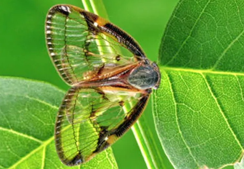 成蟲:體長為6?6.5mm,翅展為20?22mm。頭短而寬于前胸,栗褐色,前胸與中胸栗褐色,后胸為黃褐色至褐色,唇基側(cè)緣無脊線。前翅透明,翅周緣均為褐色寬帶;在前緣褐色寬帶上,于中部和外方1/4處各有1黃褐色四邊形斑紋將寬帶割成3段;前翅爪片脈上無粒突,前緣橫脈不分叉。后翅無色透明,翅脈褐色,外緣和后緣有褐色寬帶。后足脛外側(cè)有2個(gè)刺。