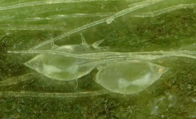 若螨:長(zhǎng)橢圓形,體形與成螨接近,背部有云狀花斑,有足4對(duì)。