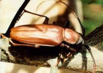 成蟲:體近橢圓形,長(zhǎng)為15?63 mm,寬為8?25 mm,個(gè)體大小差異較大。體棕紅色,前胸背板色澤較深,頭部及觸角基部3節(jié)棕黑色。頭部前額中央凹陷,上顎發(fā)達(dá),向內(nèi)彎勾。復(fù)眼很大,黑色,幾乎占頭部的一半。下顎須末節(jié)最長(zhǎng),端部寬。觸角基瘤寬闊,彼此接近。雄蟲觸角粗大,扁寬,長(zhǎng)達(dá)鞘翅末端,雌蟲觸角細(xì)小,長(zhǎng)達(dá)翅鞘中部。前胸背板寬闊,兩側(cè)緣各有3個(gè)鋸齒,鞘翅寬于前胸,每翅有2?3條縱脊線,靠中縫2條近端處相接。