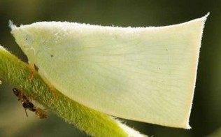 若蟲:成長(zhǎng)若蟲體長(zhǎng)約8mm,白色,稍扁平,翅芽末端平截,全身被白色蠟粉,腹末有粗長(zhǎng)蠟絲束。