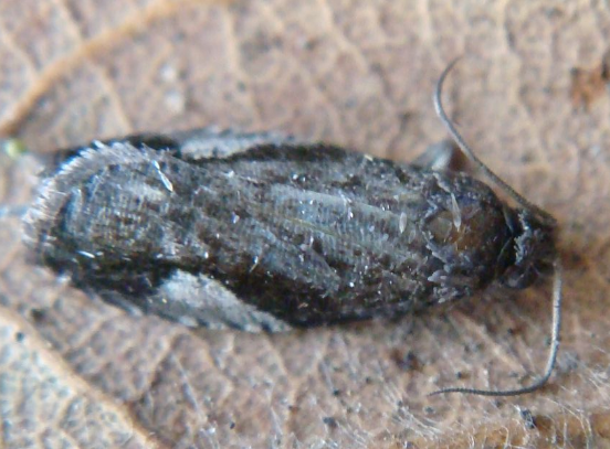 成蟲:體長5?8mm,翅展17?18mm,頭部黑褐色,單眼1對,頭頂具疏松黑色毛叢,唇須黑色,前伸;觸角絲狀,基部較粗,黑褐色。前翅近長方形,黑褐色,邊緣具細(xì)毛,前緣近2/3處有淡黃色三角形斑塊,角端有缺刻,斑塊外圍深黑色,前緣有10條明顯鉤狀紋;翅后緣基部有叢毛。后翅灰黑色,前緣肩角至中部灰白色。足內(nèi)側(cè)白色,外側(cè)灰黑色,足上鱗片具金屬光澤。前足具凈角器,跗節(jié)4節(jié);中足端距2個(一長一短),跗節(jié)4節(jié);后足距4個,中距2個,端距2個,跗節(jié)5節(jié)。雄成蟲腹面披灰黑色毛,后足脛節(jié)具長灰黑毛,雌成蟲腹面灰白色,后足脛節(jié)不具灰黑長毛。