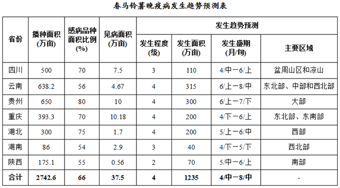 據(jù)氣象部門預報,今年春季西南及武陵山區(qū)馬鈴薯產(chǎn)區(qū)大部氣溫比常年同期偏高,4月份,湖南、四川西部、貴州東部等地降水較常年同期偏多;且馬鈴薯種植區(qū)多為山區(qū)和丘陵地區(qū),多霧多露,有利于馬鈴薯晚疫病發(fā)生。